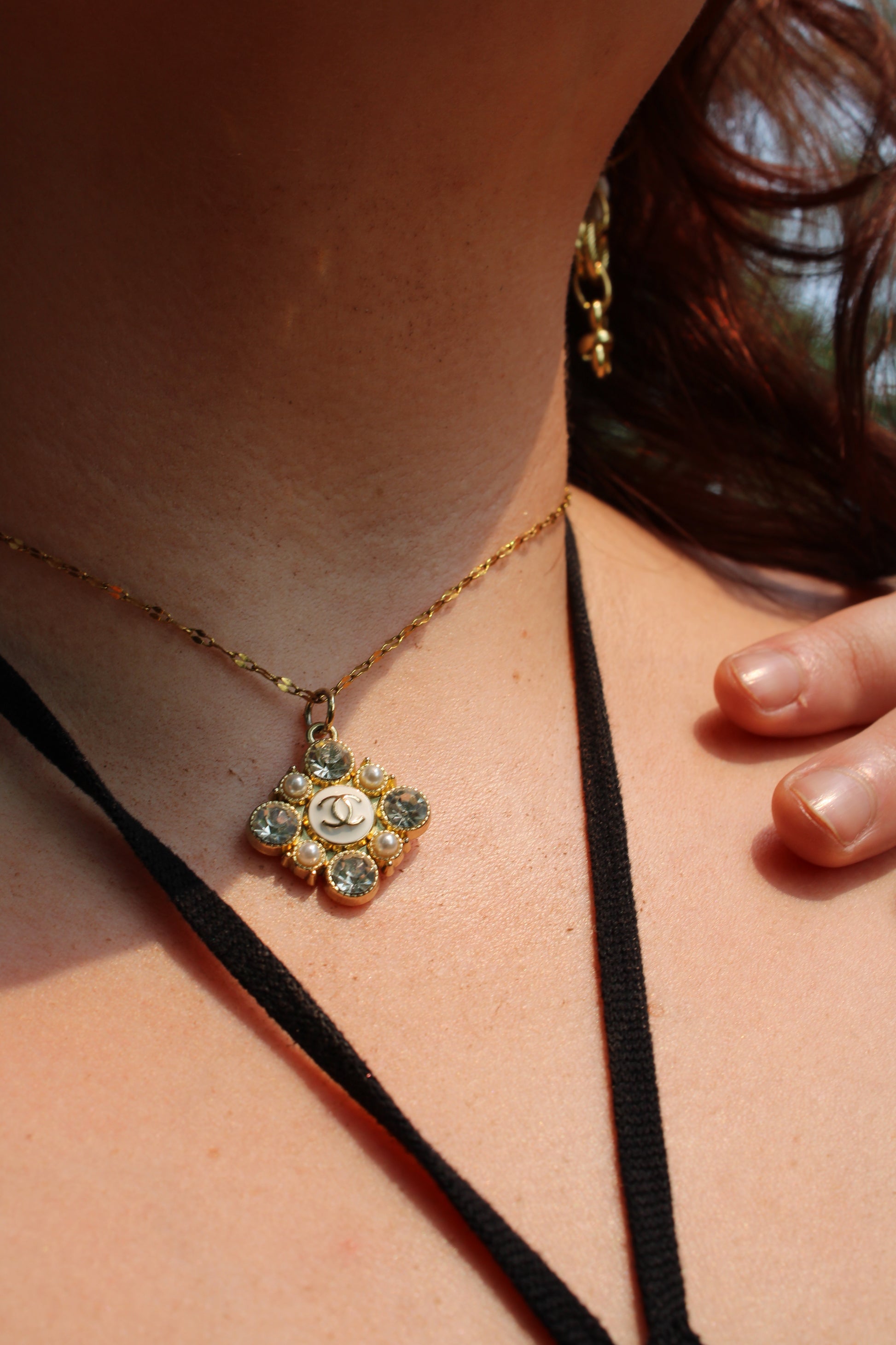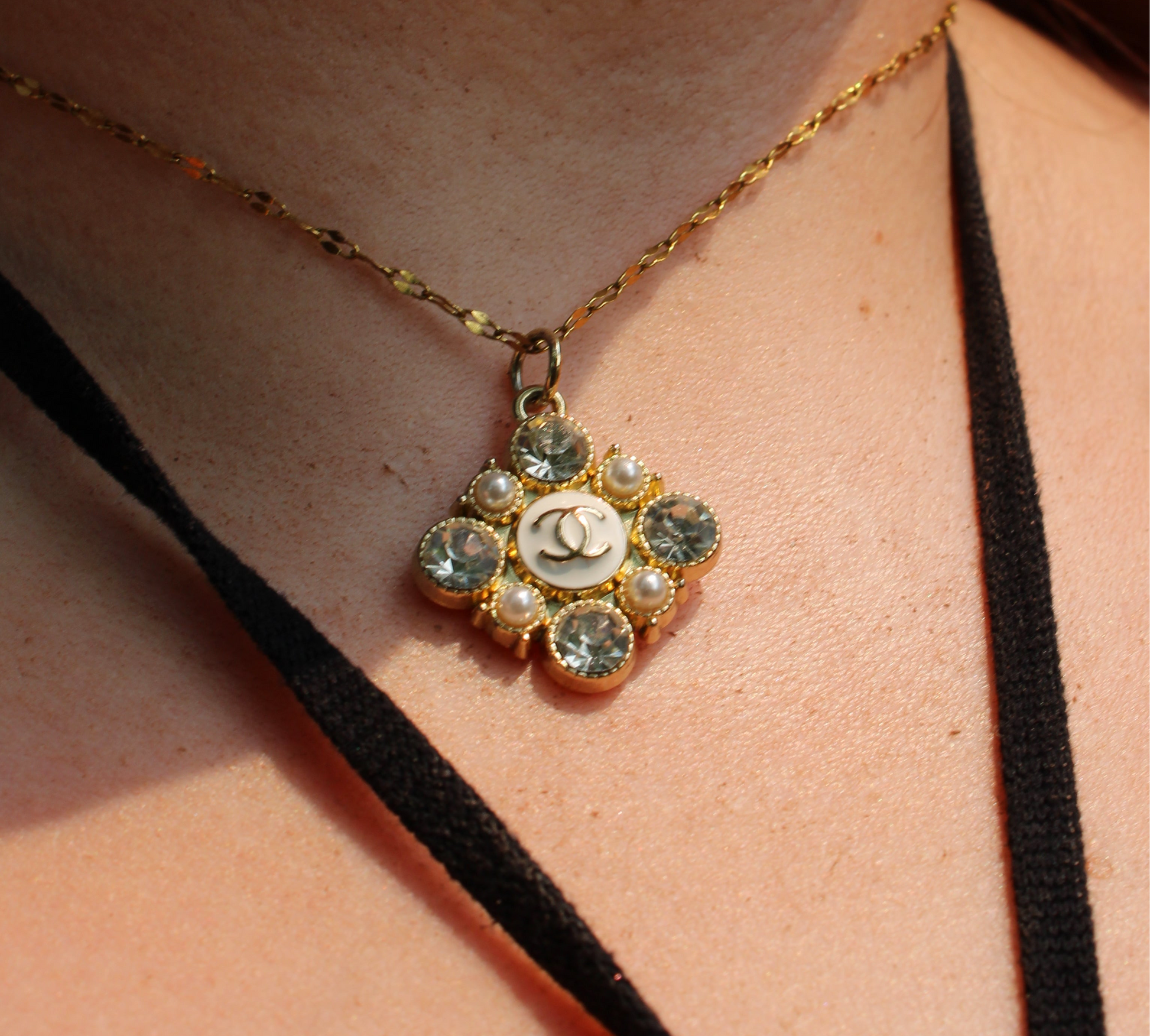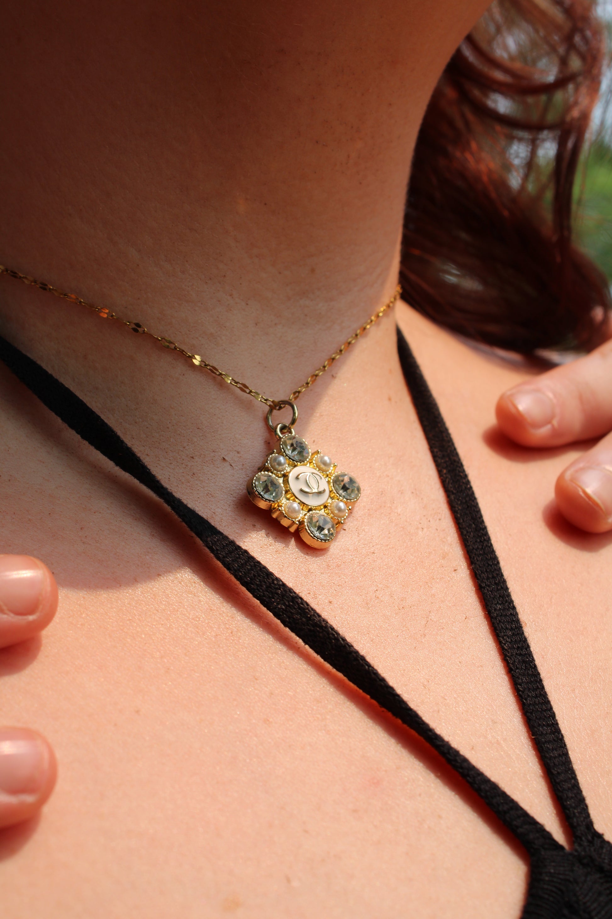 Up-Cycled Designer Chanel Pendant on Gold Plated Stainless Chain. Water resistant. Solid gold or gold filled options are available, just ask.