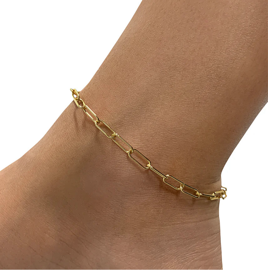 1 stainless steel or gold plated paper clip anklet. This a minimal, long lasting, 9 inch anklet. Great for layering. You can your own add charms, or wear by its self. Your choice of a silver or gold chain. Enjoy!