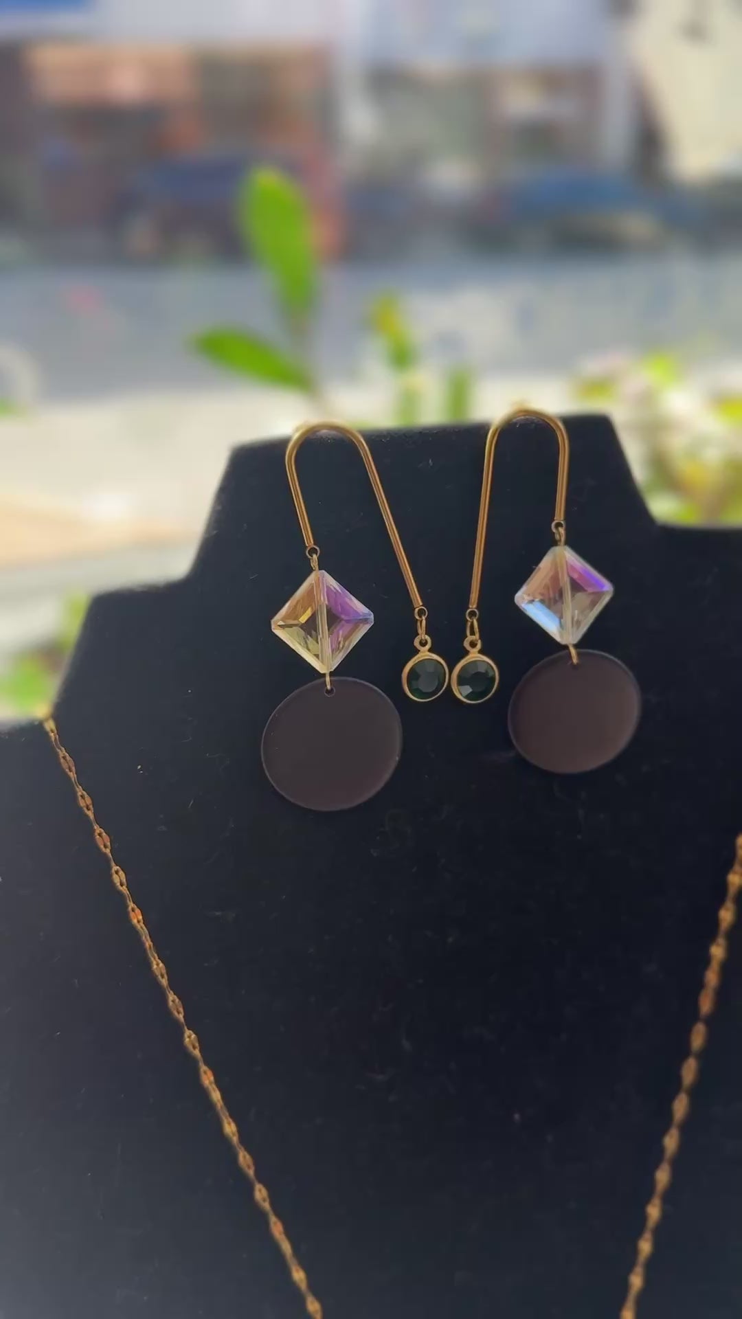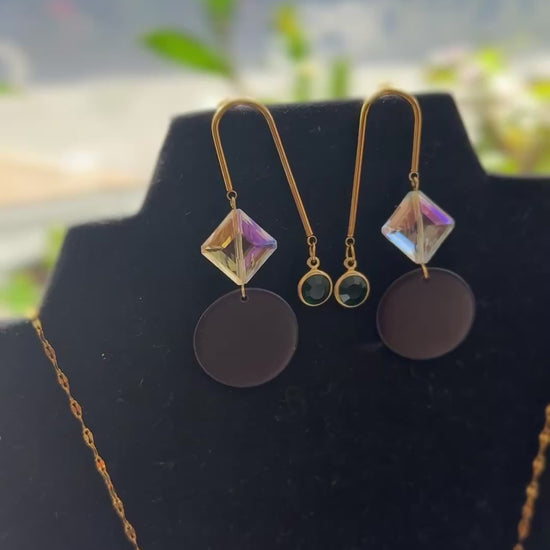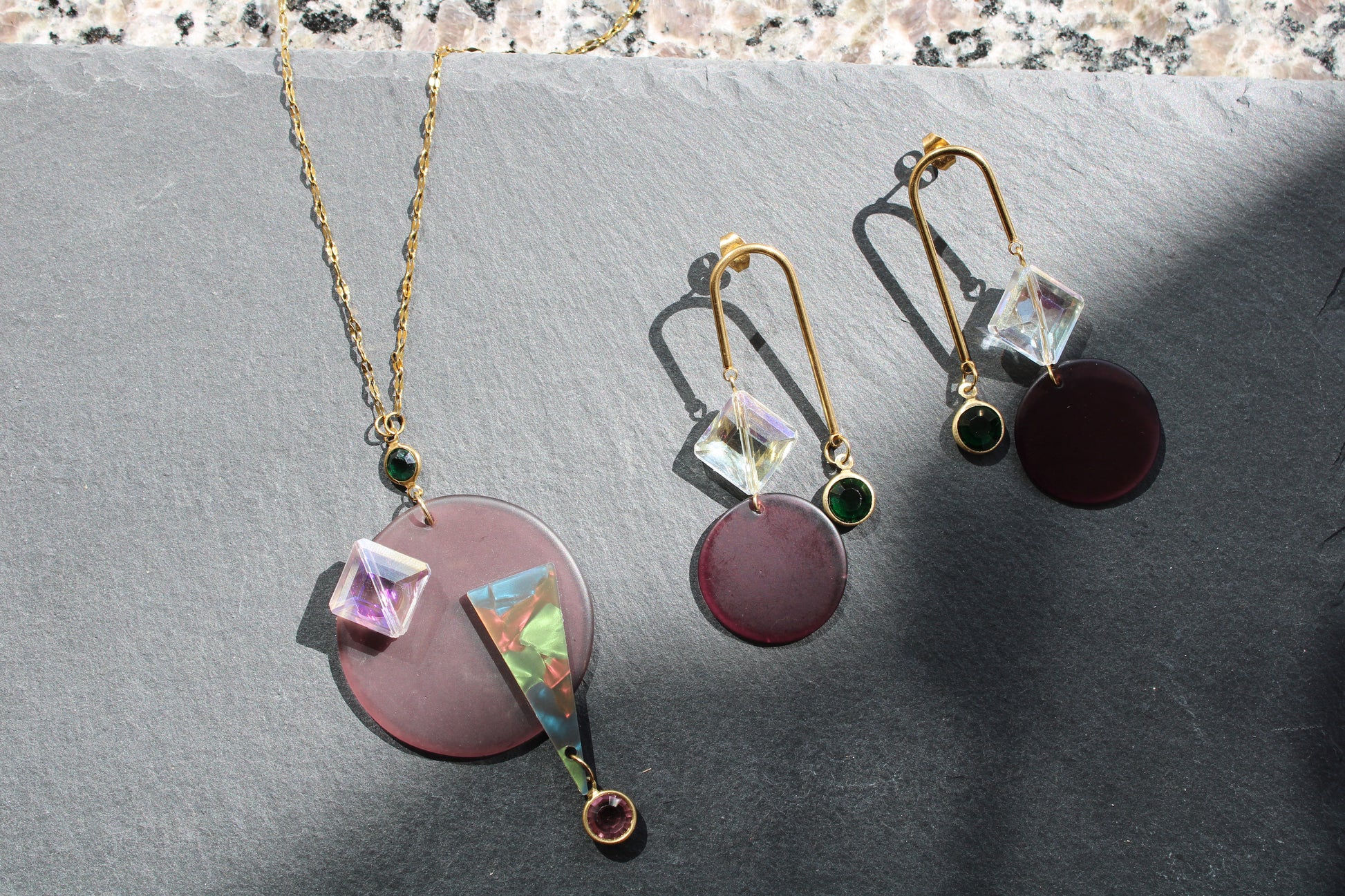 UpCycled Glass reworked into jewelry. 16 inch necklace or statement earrings. This collection was created using left over glass pieces from Artful Fox, a local stained glass artist, then styled and reworked by Dream In Gold. All chains are stainless steel in silver or gold plating. Pendants over all are alloy. Please avoid water and oils. Can add extensions chain if needed. Just ask!